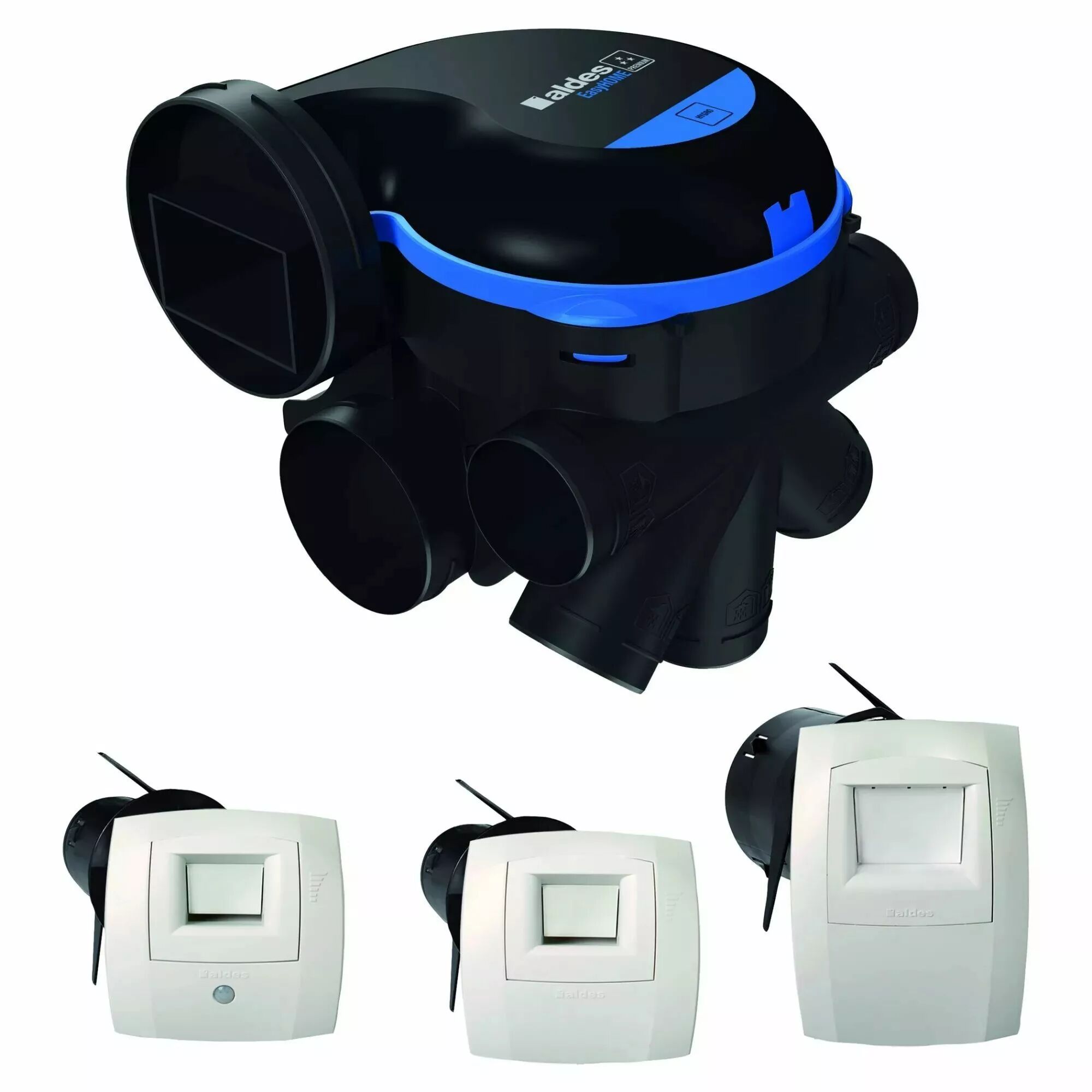 Réf. : ALD 11033502 Kit VMC simple flux hygroréglable EasyHOME HYGRO Premium MP pour pieuvriste avec moteur EC Moyenne Pression pour une ventilation optimisée garantissant des débits conformes RE2020 et livré avec 3 bouches BAHIA® CURVE.