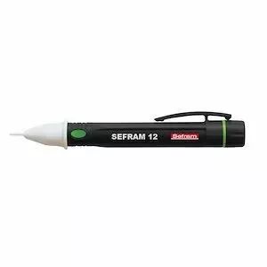 Le SEFRAM 12 est un testeur de tension sans contact avec une indication lumineuse, conçu pour effectuer des tests de présence de tension alternative (AC) par approche du dispositif (une prise par exemple, un câble électrique, des portes fusibles,) et cela sans contact électrique. Si l'objet testé est sous tension, la LED rouge située dans la tête du SEFRAM 12 va s'allumer et un signal sonore sera émis.