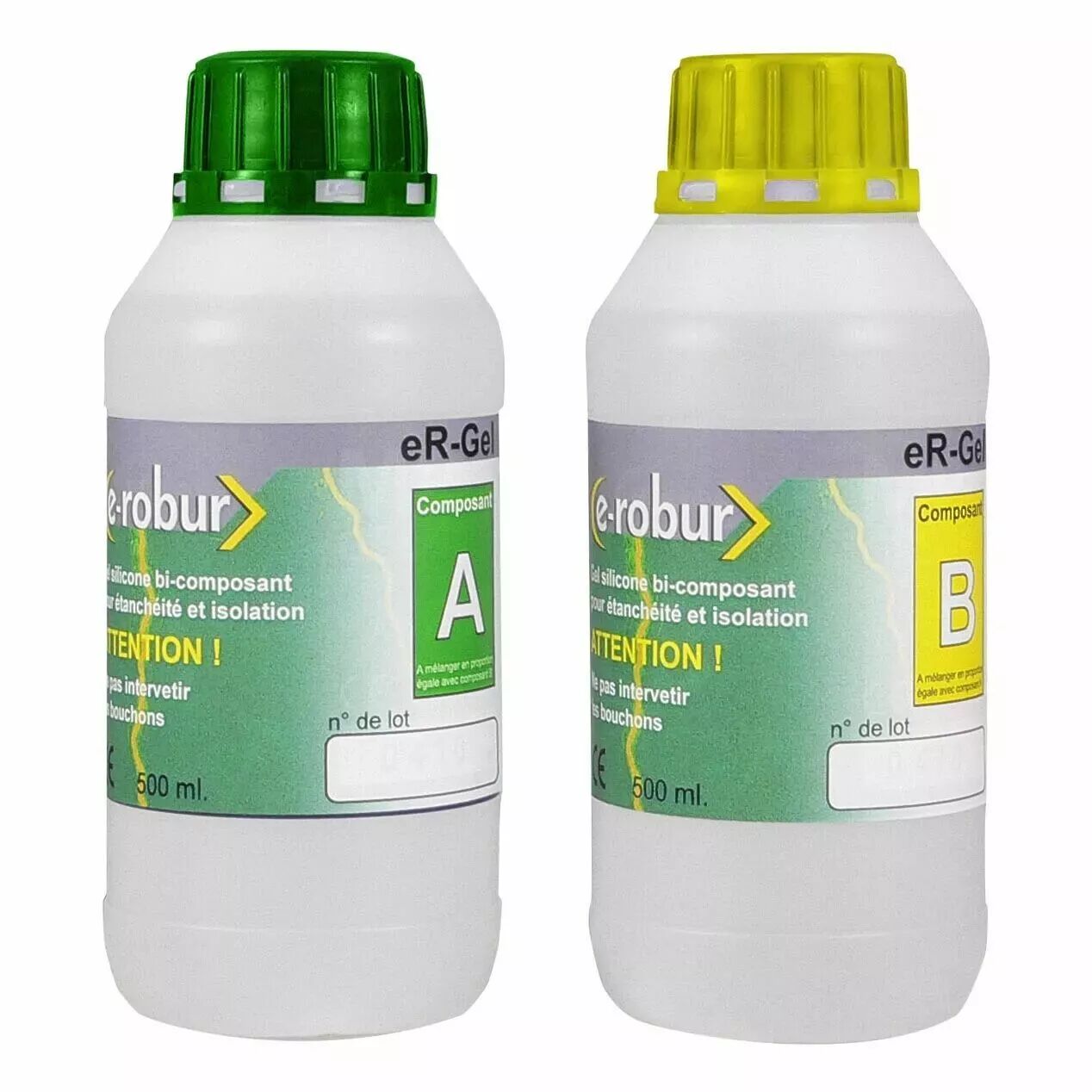 Gel silicone bi-composant pour l'étanchéité et l'isolation des boites de dérivation. Réaccessible. Kit de 2 bouteilles de 0,5 l.