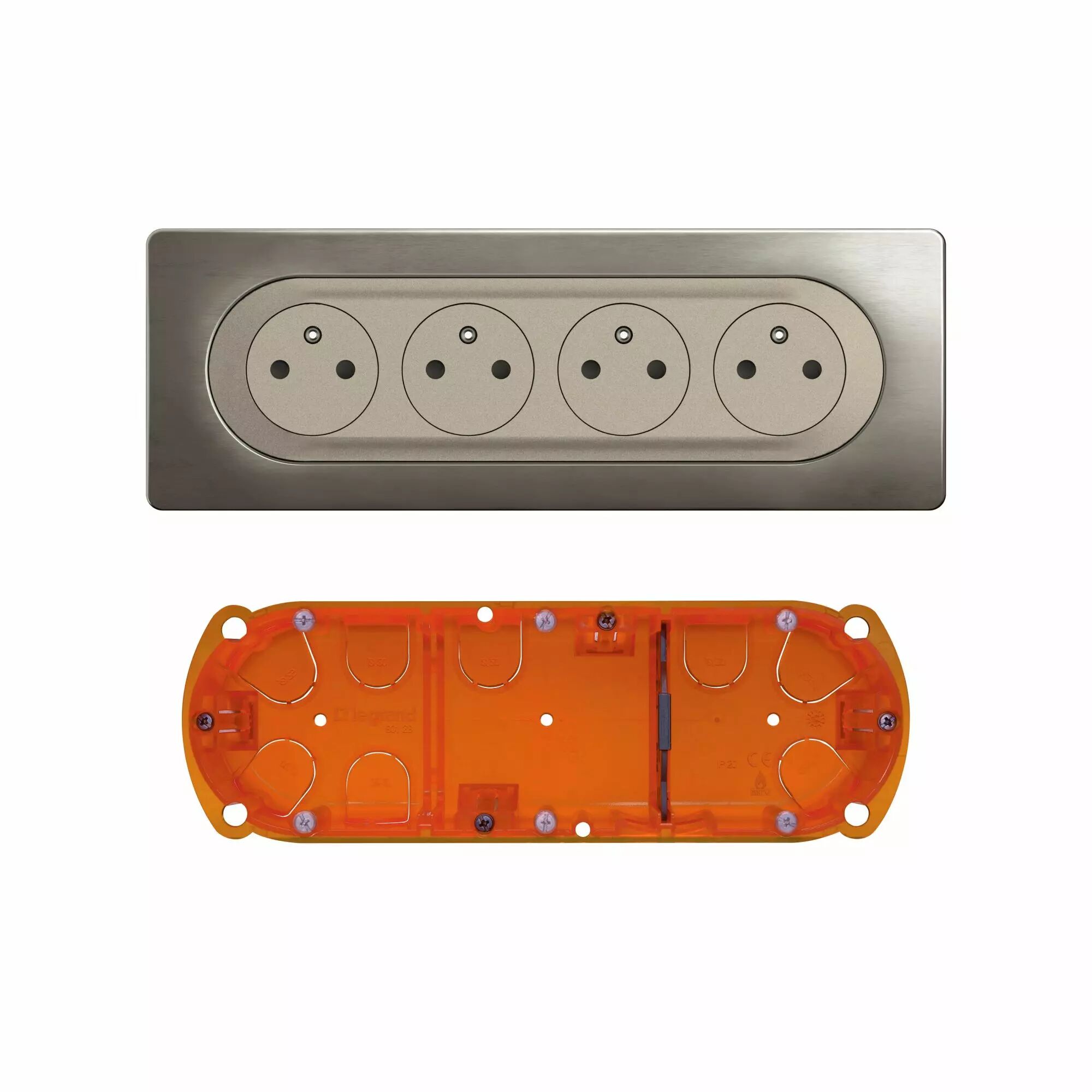 Kit quadruple prise 2P+T Surface Céliane précâblée compacte pour pose en encastré - livré complet avec support, enjoliveurs Titanium, plaque Acier Satiné 6/8 modules et boîte d'encastrement multi-matériaux 3 postes