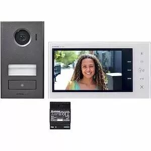Kit vidéo avec platine aluminium injecté, pose saillie avec 1 platine JVDV, 1 moniteur JV1MD et 1 alimentation PS2420DM, technologie 2 fils intégral & écran 7' touches sensitives, mains libres avec mémoire d'images