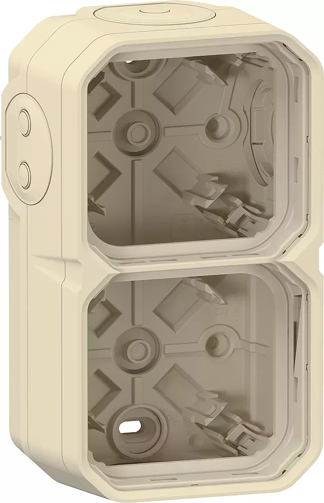 Boîtier saillie étanche Plexo 2 postes pour montage horizontal ou vertical, sans cloison, avec 3 embouts à membrane amovible et perforable sans découpe 1 entrée et 1 embout 2 entrées - sable