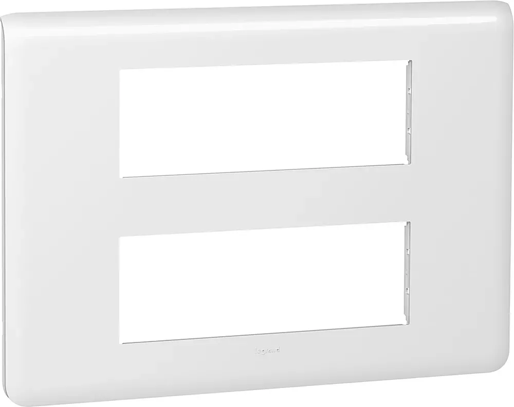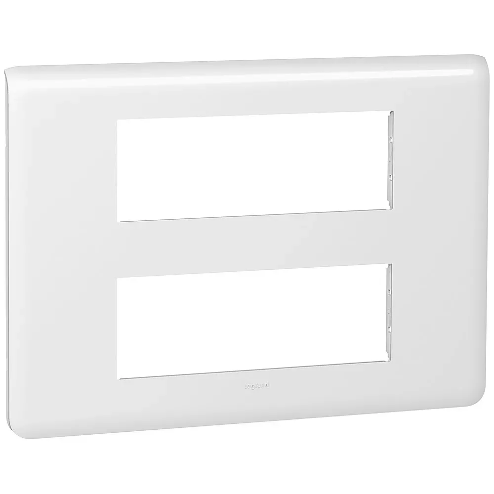 Plaque de finition Mosaic 2x6 modules blanc RAL9003 finition brillante à clipser sur support Batibox 2x6, 2x8 ou 2x3x2 modules - démontage facile et rapide grâce à la présence d'encoches