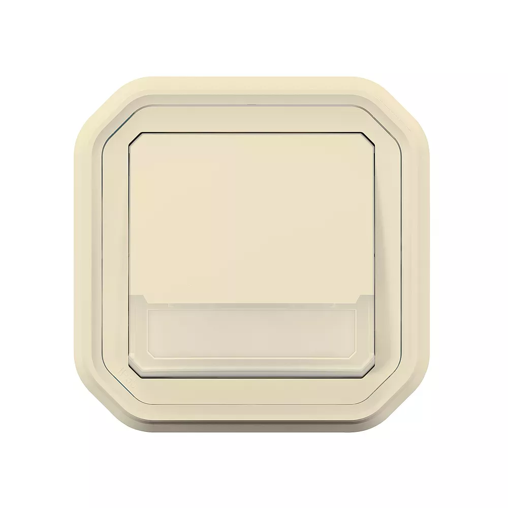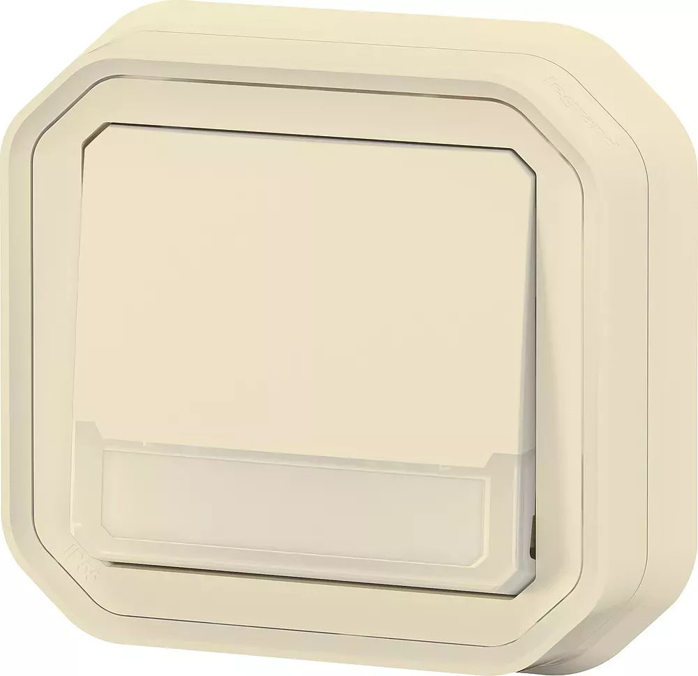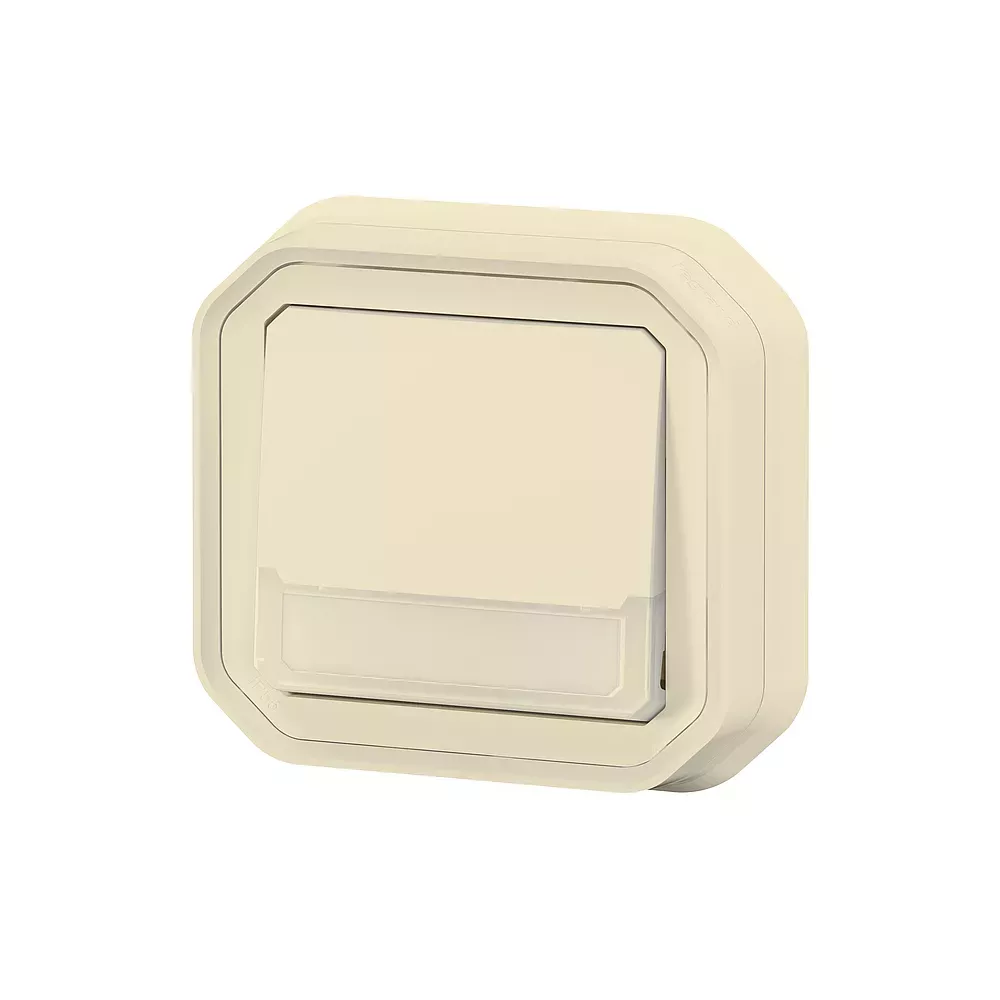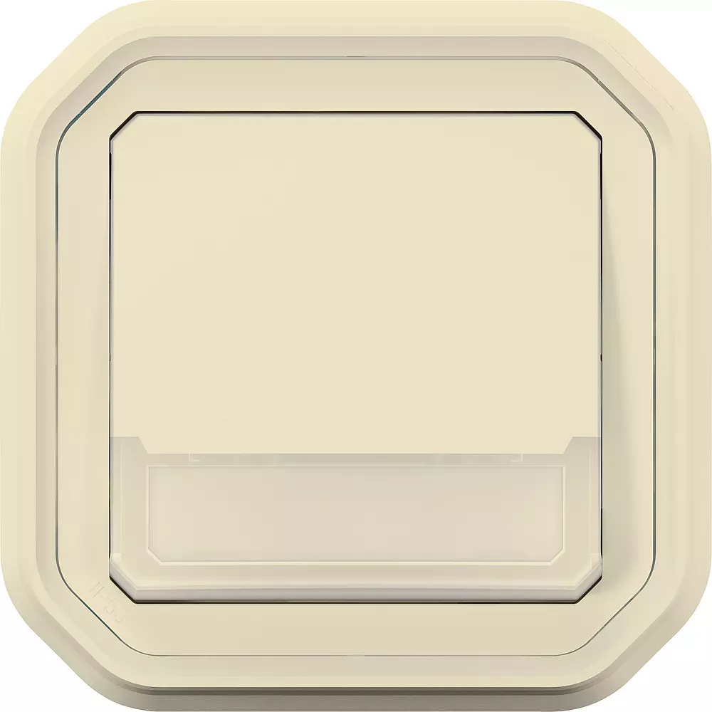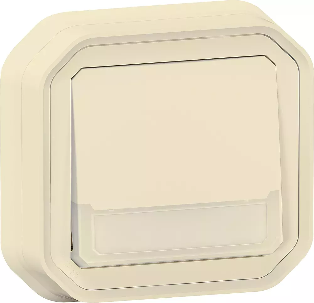 Poussoir inverseur NO-NF lumineux avec porte-étiquette étanche Plexo 10A IP55 IK08 livré complet avec voyant 12V et support plaque pour fixation en encastré - sable
