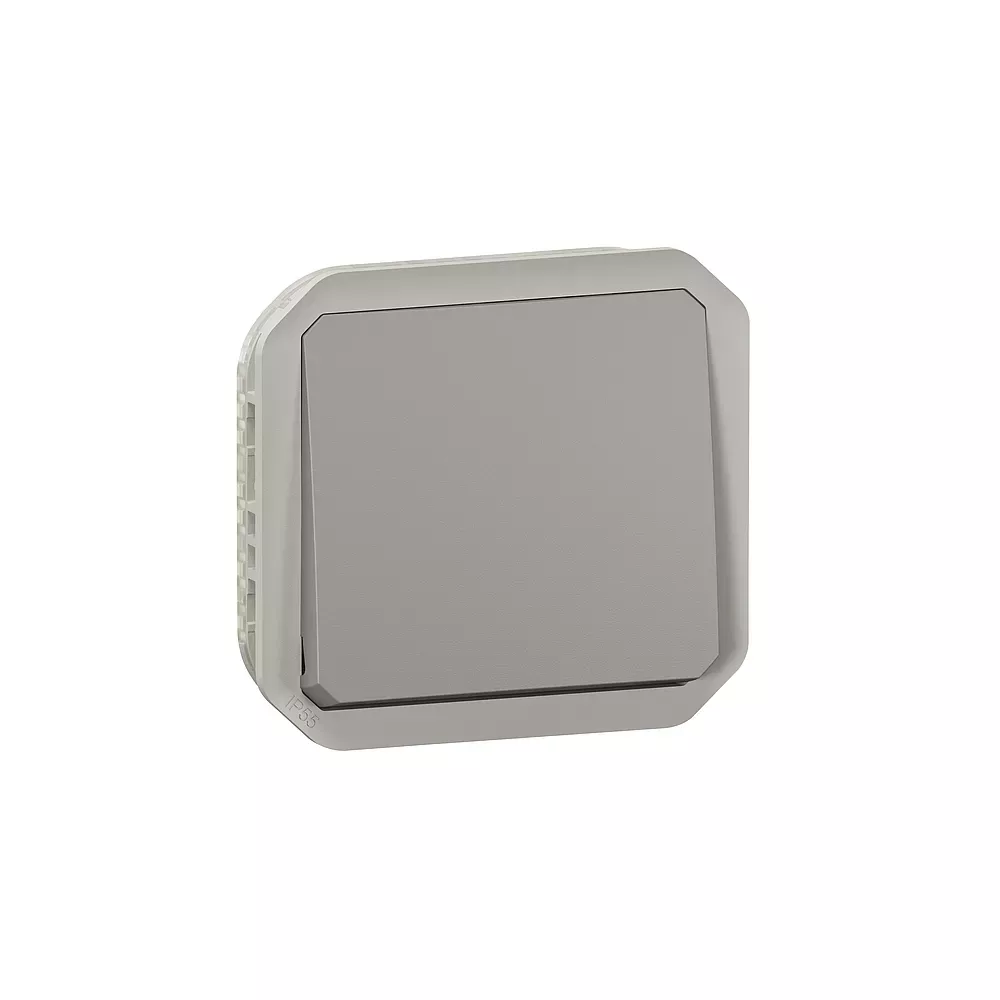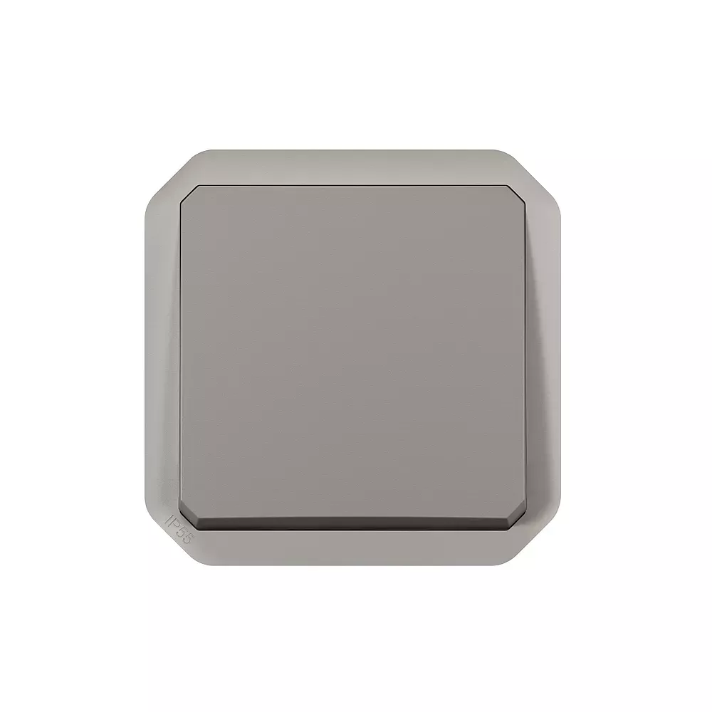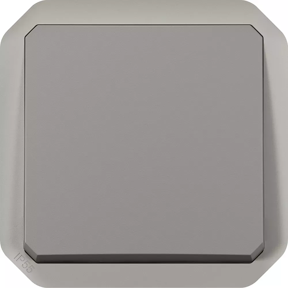 Poussoir NO étanche Plexo 10A IP55 IK08 à équiper de support plaque ou boîtier saillie, avec enjoliveur gris