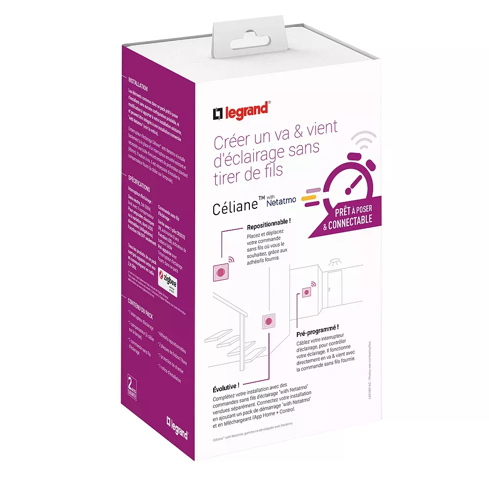 Prêt-à-poser connectable Céliane créer un va-et-vient sans tirer de fils composé de 1 interrupteur sans Neutre 230V~ et 1 commande sans fils - livré complet avec supports, protections de chantier, enjoliveurs et plaques de finition titane
