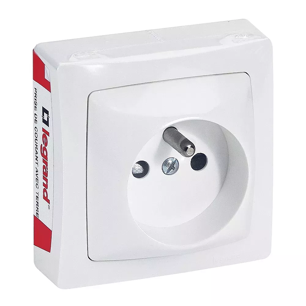 Prise de courant avec terre Appareillage Saillie avec connexion par bornes automatiques livrée complète prête à poser en finition blanc - version film