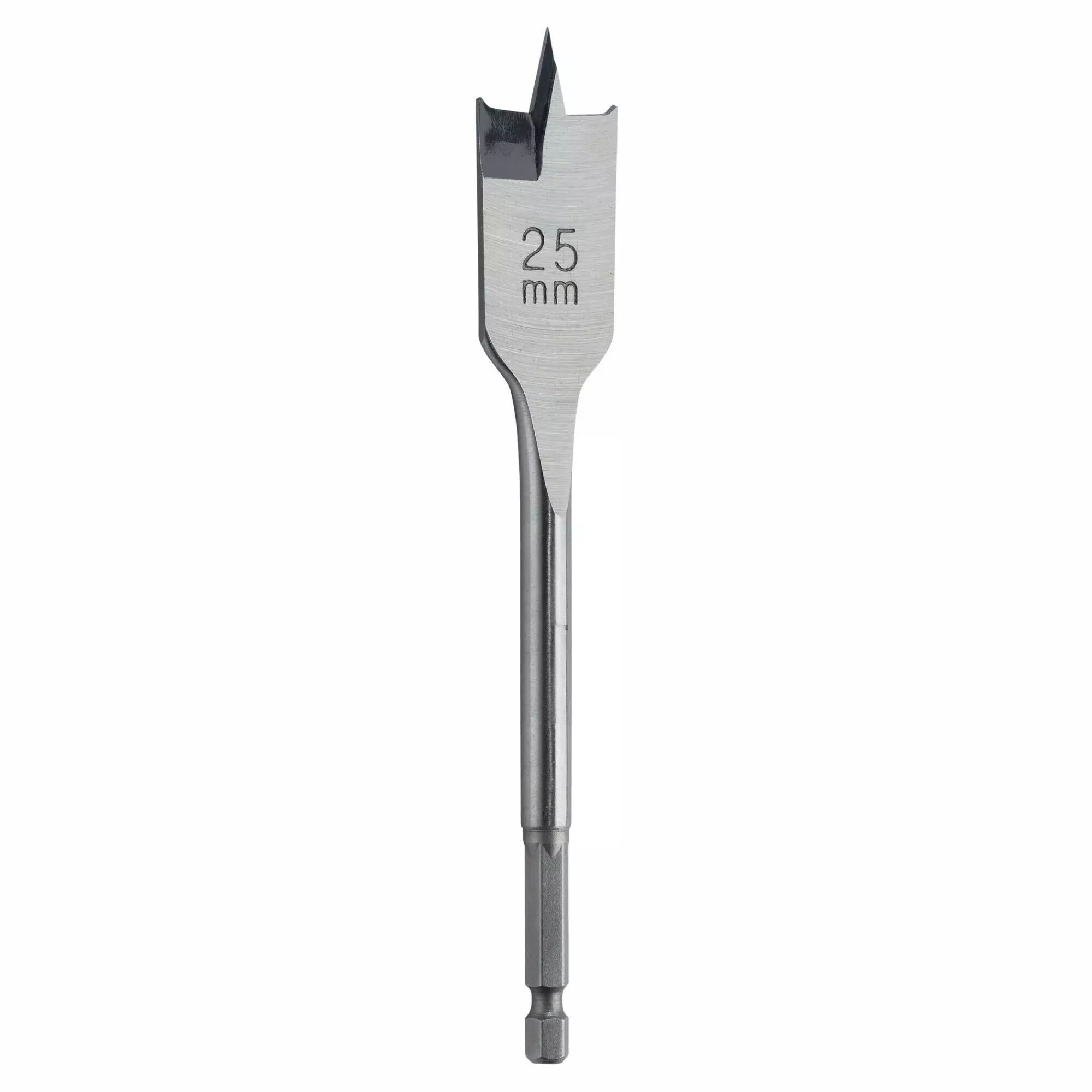 Mèche à bois plate. Perçage 28 mm, queue hexagonale 6,35 mm, long 160 mm.