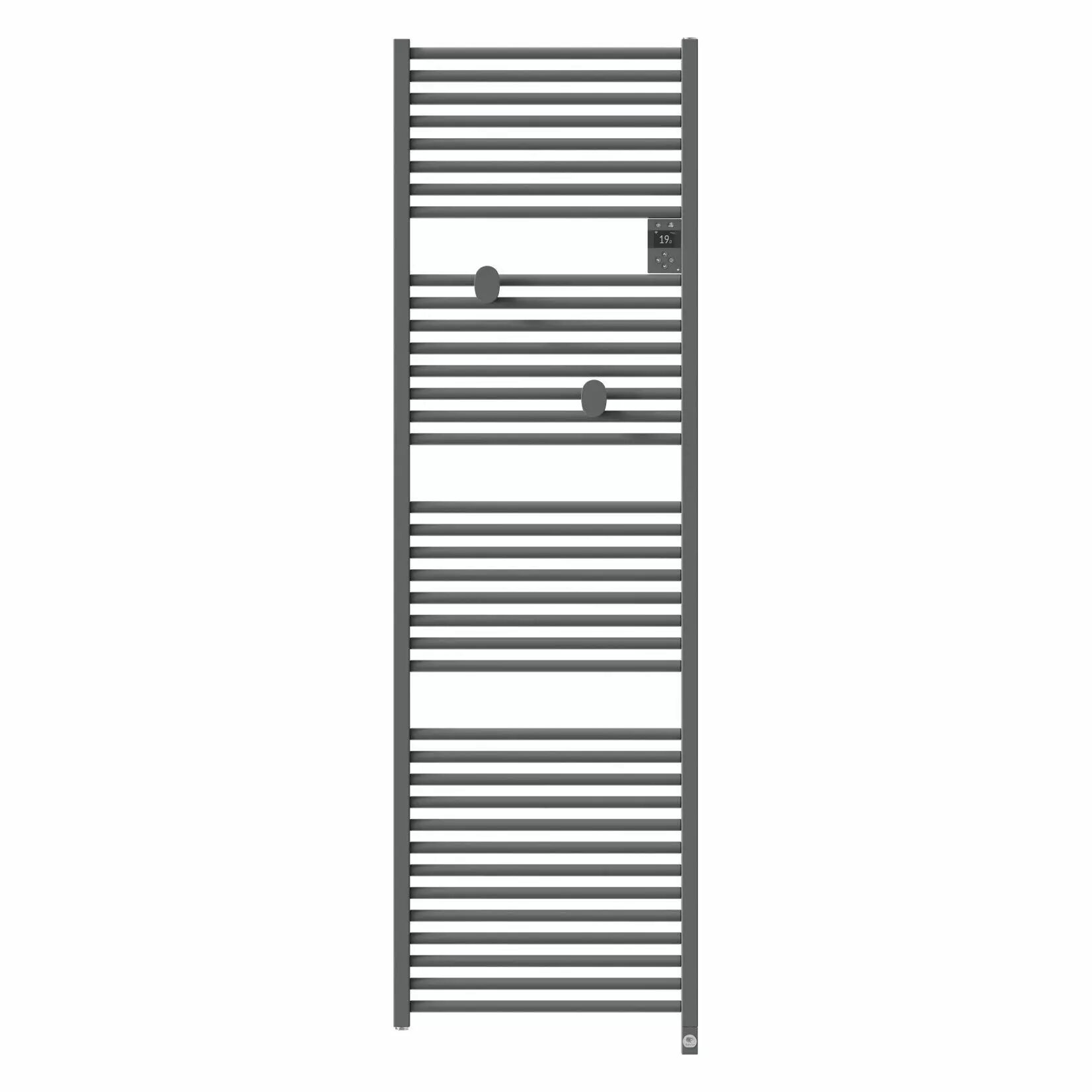 Radiateur sèche-serviettes électrique connecté Riva 5 1000W Gris menhir - boitier de commande digitale avec l'affichage de l'heure et 2 patères repositionnables.