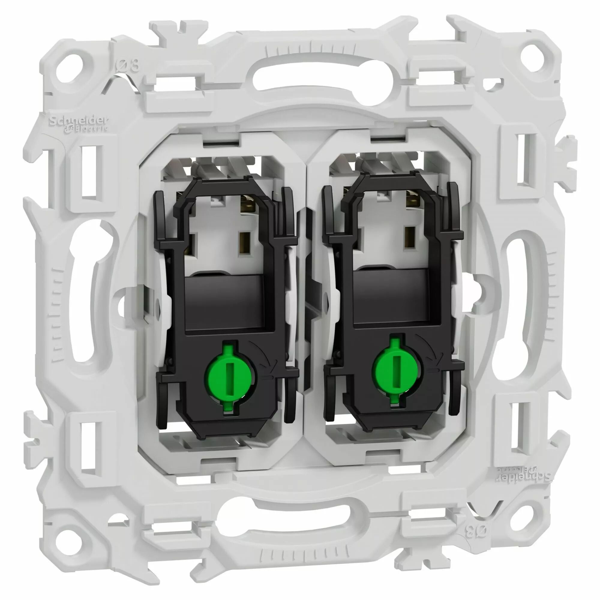 Réf. : SHN S980214 Odace - double va-et-vient ou poussoir sans enjoliveur - à équiper d'un enjoliveur double : standard ou levier ou Intégral - multifonctionnel - 3x2 bornes auto - 10AX 250V CA 50Hz - IK04 IP21D - cache peinture - certifié NF